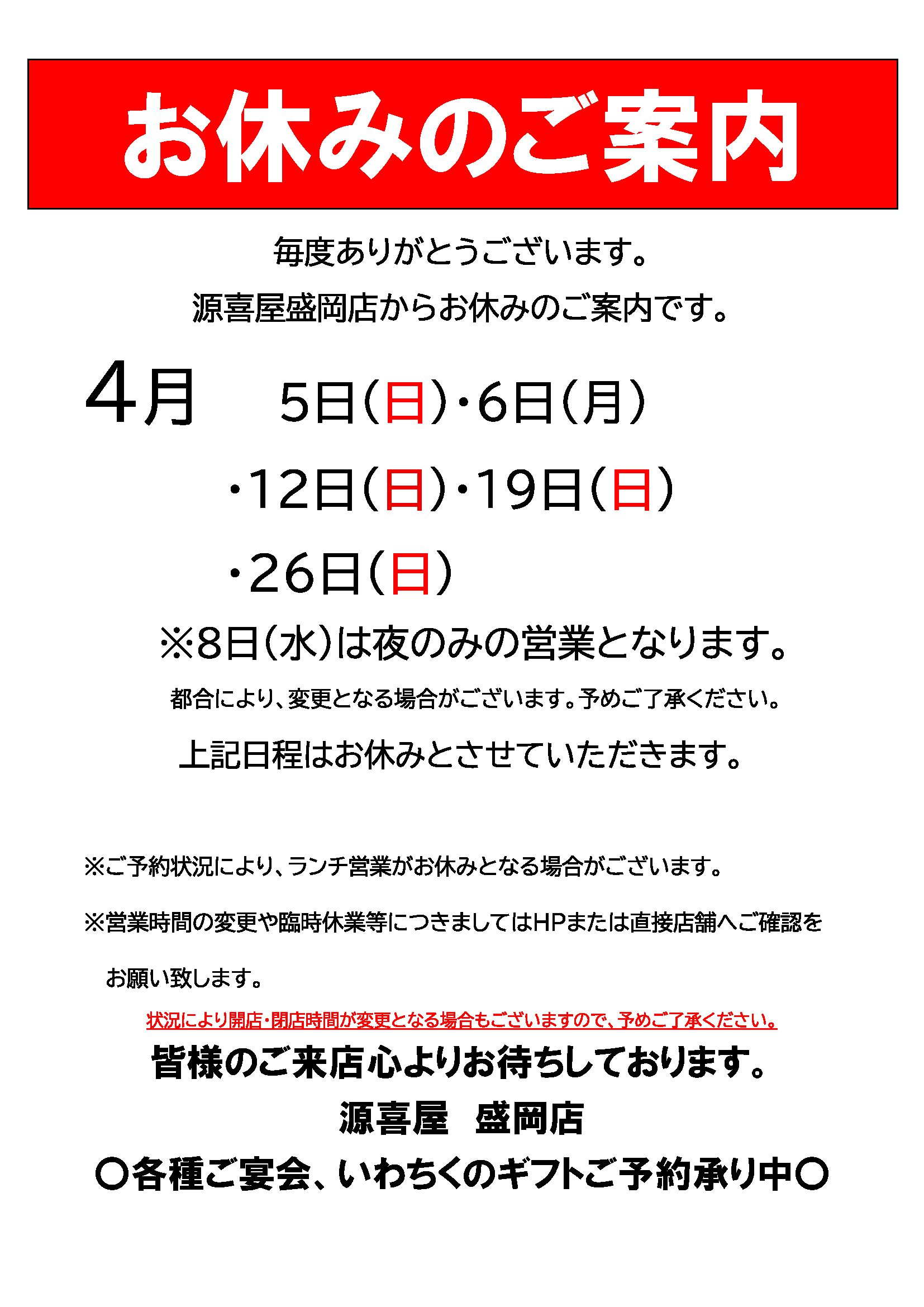 いつも源喜屋盛岡店をご利用頂きありがとうございます。