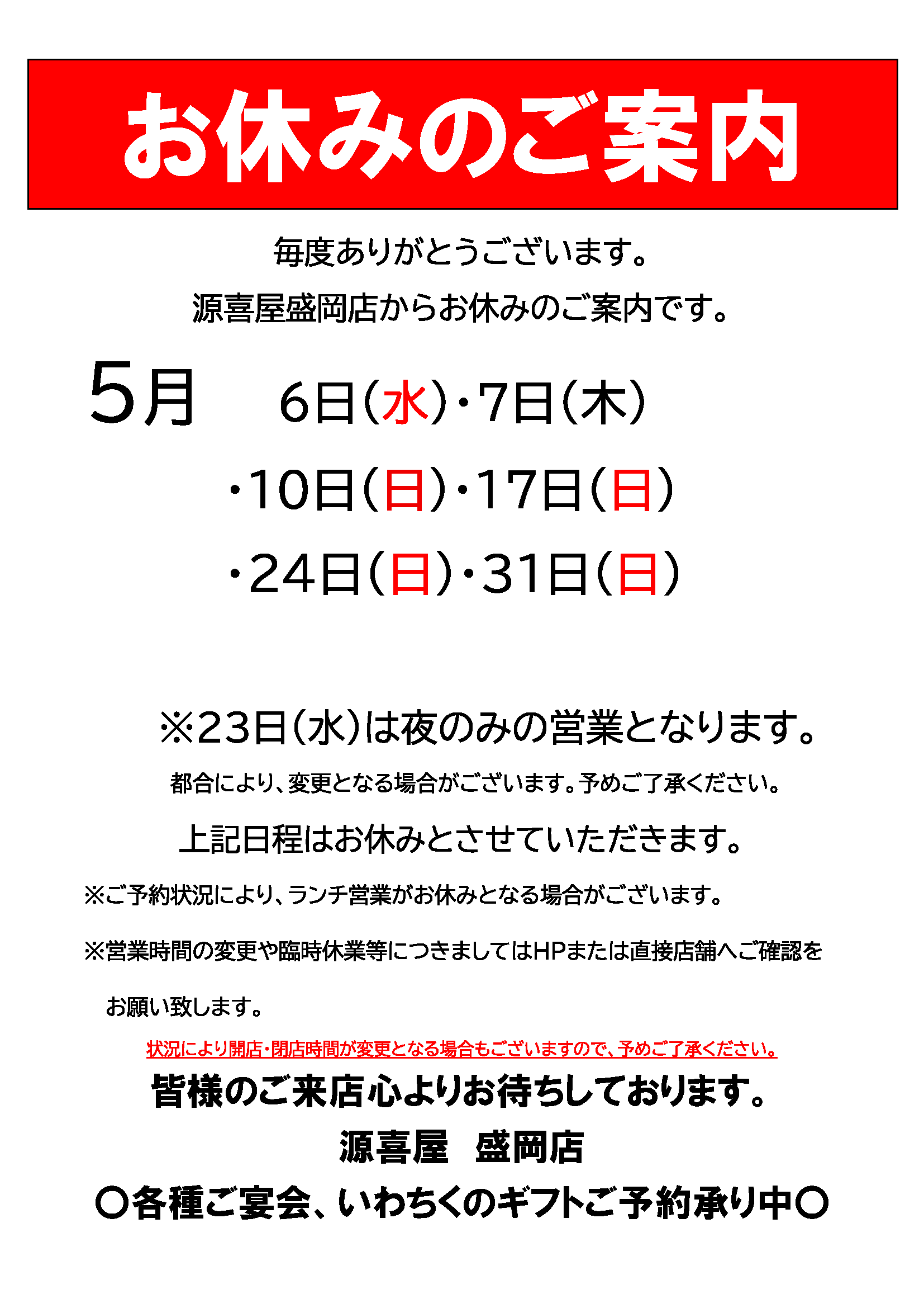5月の休業日のお知らせ